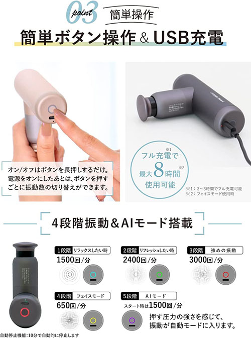 - 【5段階動作モード】4つの振動数の切替とAIモードを搭載。AIモードでは押し当てる圧力を検知して振動数を切り替えます。いちいち振動数の切り替えをしなくても押し当てる圧力を変えるだけで振動数を変えることができます。