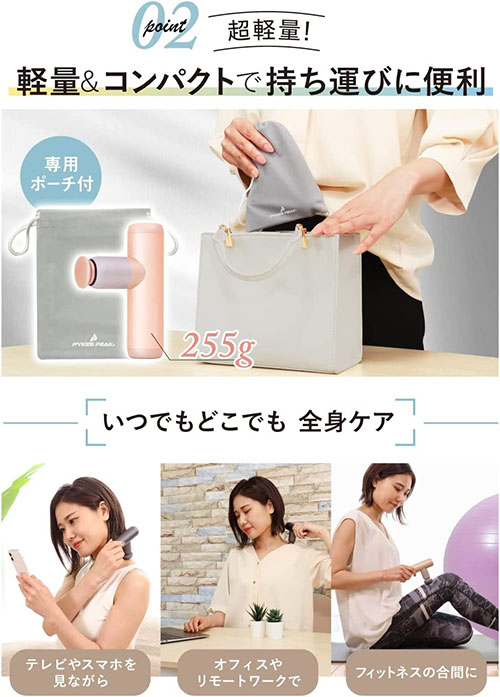 - 【これ1台で全身OK!】コンパクトなのにパワフル!4種類のアタッチメントでデリケートな顔などの部分から肩、腰、足裏などさまざまなケアしたい部位にフィット!全身ケアできます。【軽量&コンパクトで持ち運びに便利!】本体重量255gと超軽量、しかも手のひらサイズ!専用収納ポーチ付きでどこにでも持ち運べます。テレビやスマホを見ながら、オフィスやリモートワークのちょっとした空き時間に、フィットネスの合間に使用シーンも選びません。