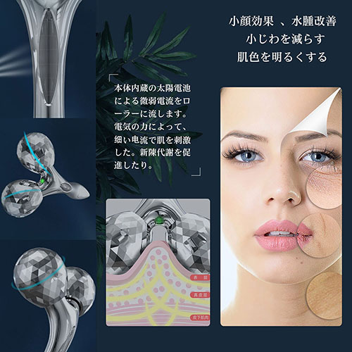 - 【微電流式美容ローラー+(ギフトT字型の目元エステ)】充電不要式、ハンドルに設けられたソーラ一パネルから光を取り込み、微弱電流「マイクロカレン卜」を発生させます。 充電不要、パネルから光を取り込み、微弱電流「マイクロカレン卜」を発生させできます。電気の力によって、细い电流で肌を刺激した。新陳代謝を促進したり。むくみ、ハリ、しわの消去に効果もあります。また、肌のハリが生まれるなどの効果も得られます。T字型の目元エステ、しわやたるみ、くまなど目のこりや血行をよくしたい方に。そのため、疲れ目の改善に効果的です。