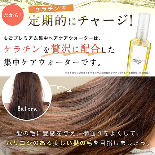 もごプレミアム集中ヘアケアウォーターは、髪の毛の主成分であるケラチンやアミノ酸を主成分にした濃色トリートメントウォーターです。