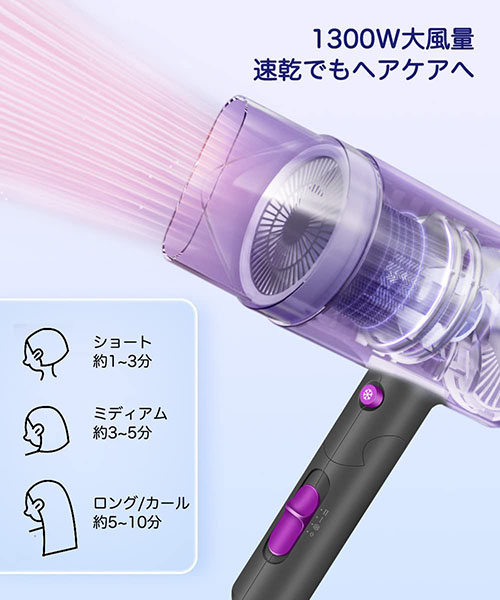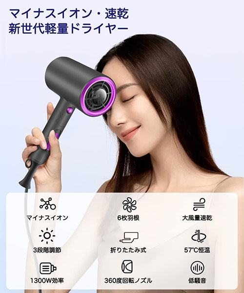 - 【あっという間に乾く❤1300W大風量&3段階の風速調整】本ヘアドライヤーは強力1300Wモータが搭載されるので、気流は2.26m³/min、最大14.3m/sの風量となります。1800Wのヘアドライヤーと比べると、大風量がある一方、電気の消費量が低くて、電気代が節約できます。冷風・温風・熱風3モード有り、お好みに合わせて切り替えることができます。 さらに冷風スイッチも搭載しているのでスイッチを押すと素早く温風を冷風に切り替えます。