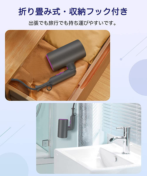 - 【折りたたみ式&PSE認証済み】折りたたみ式のヘアドライヤーはコンパクトなデザイン、持ちやすいハンドル付きヘアドライヤー。本体をくるめば持ち運びも簡単。海外対応なので、旅行にもオススメです。PSE認証取得。
