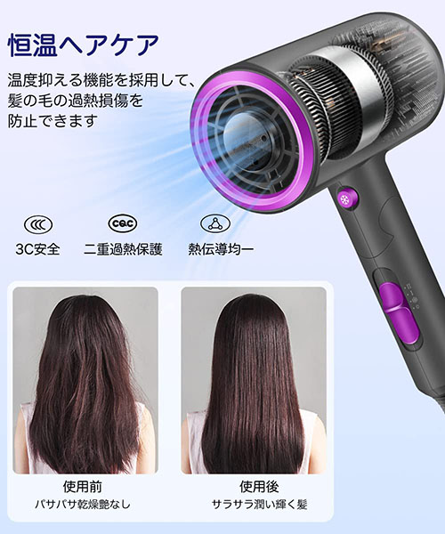 - 【57℃恒温ヘアケア❤過熱保護装置付き】57℃恒温デザインが過熱による髪の水分流失や損傷を減らし、髪の艶を守ります。また、ドライヤーは温度過昇防止装置が搭載されており、57℃恒温ヘアケアを守れ、本体が危険な温度まで上昇すると自動的に電源を中断することになります。